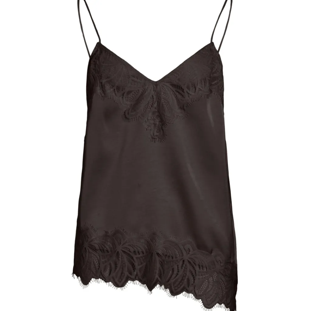 Let og elegant top med v-hals og ærmeløs model i satin, der sikrer en glat overflade. Regular fit og blondedetalje gør den velegnet til både hverdag og fest.